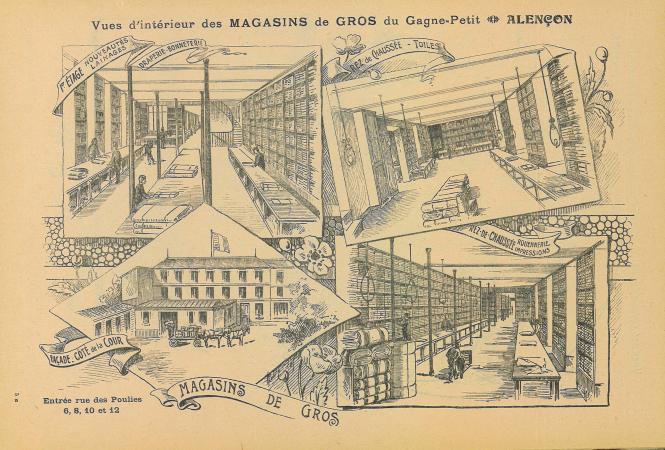 Extraite de l’agenda de 1906, la page reproduite ici présente quatre « vues d’intérieur des magasins de gros » du Gagne-Petit. Ces magasins ne vendent pas à des particuliers mais à d’autres magasins, concurrents ou filiales de la Maison Romet. Les produits commercialisés peuvent être eux-mêmes achetés dans les entreprises du Nord de la France, de la région parisienne ou lyonnaise ou fabriqués dans les ateliers de la rue des Poulies à Alençon.